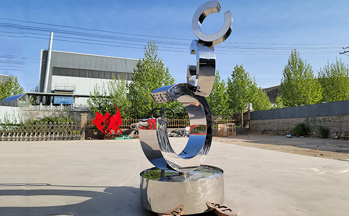 不銹鋼材質(zhì)賦予了雕塑現(xiàn)代感與時(shí)尚氣息,其光滑的表面能完美地反射周圍的環(huán)境與光影,當(dāng)噴泉開啟,水流與光影相互交織,在不同的時(shí)段、不同的天氣條件下,呈現(xiàn)出千變?nèi)f化的視覺效果。白天,陽光灑在水面與雕塑上,閃耀著金色的光芒;夜晚,配合精心設(shè)計(jì)的燈光,噴泉雕塑又成為夜空中最璀璨的存在,為城市的夜景增添了一份浪漫與神秘。